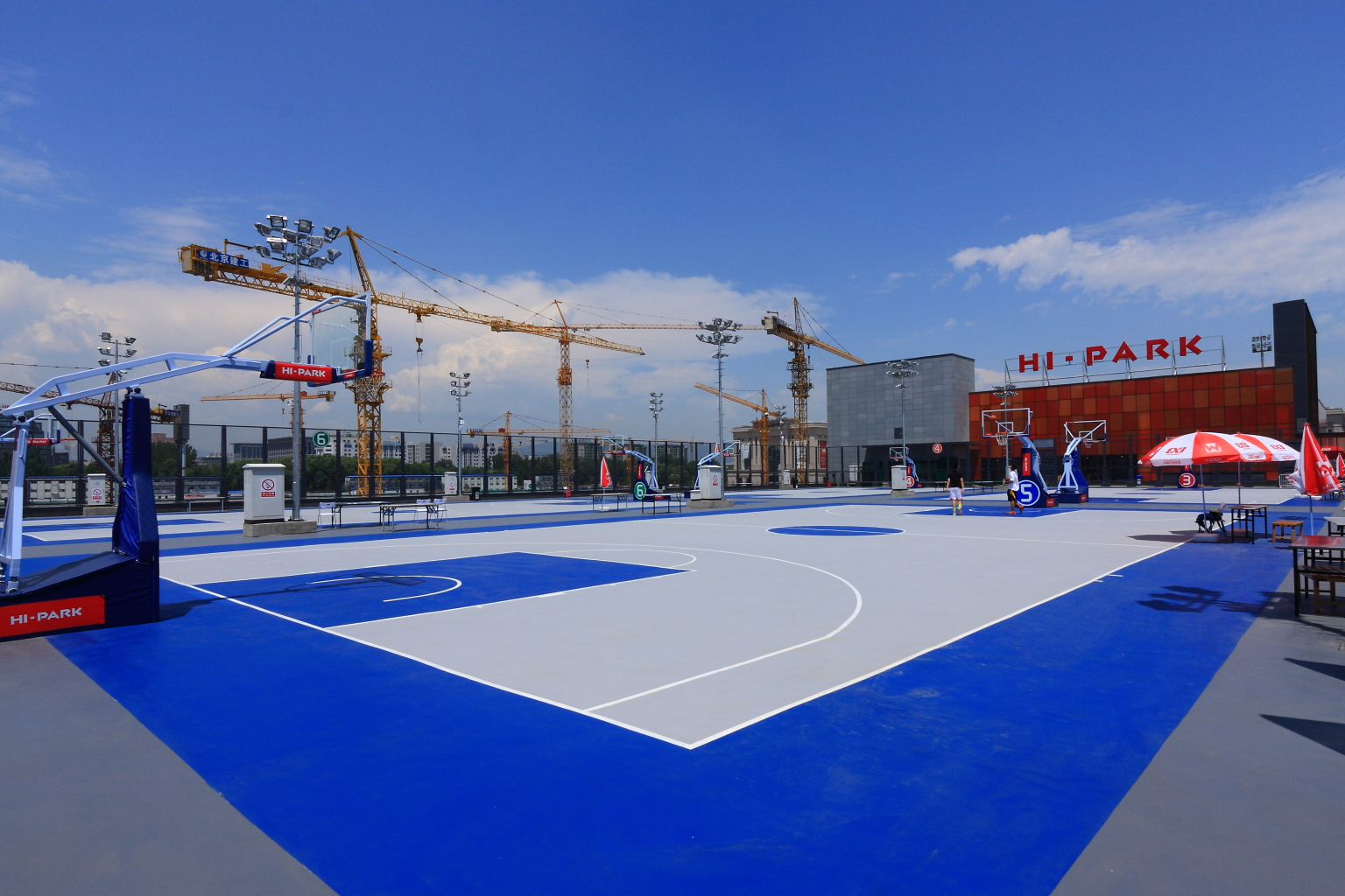 按国际篮联要求篮球场长:28米,宽:15米。在每条边线外应留有余地不小于2米作为缓冲区,即一片标准篮球场地面积(含缓冲区)为(28+2×2)米×(15+2×2)米=608平方米。若篮球架为移动式篮球架,篮球架边线外应留